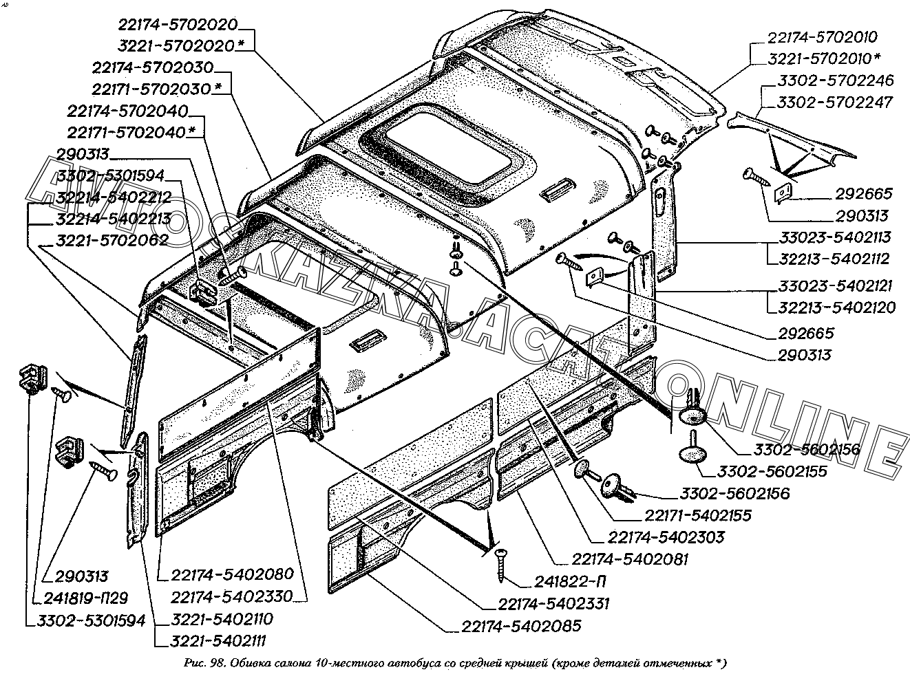 Обивка салона 10-местного автобуса со средней крышей (кроме деталей отмеченных *) ГАЗ 2217 (22171)