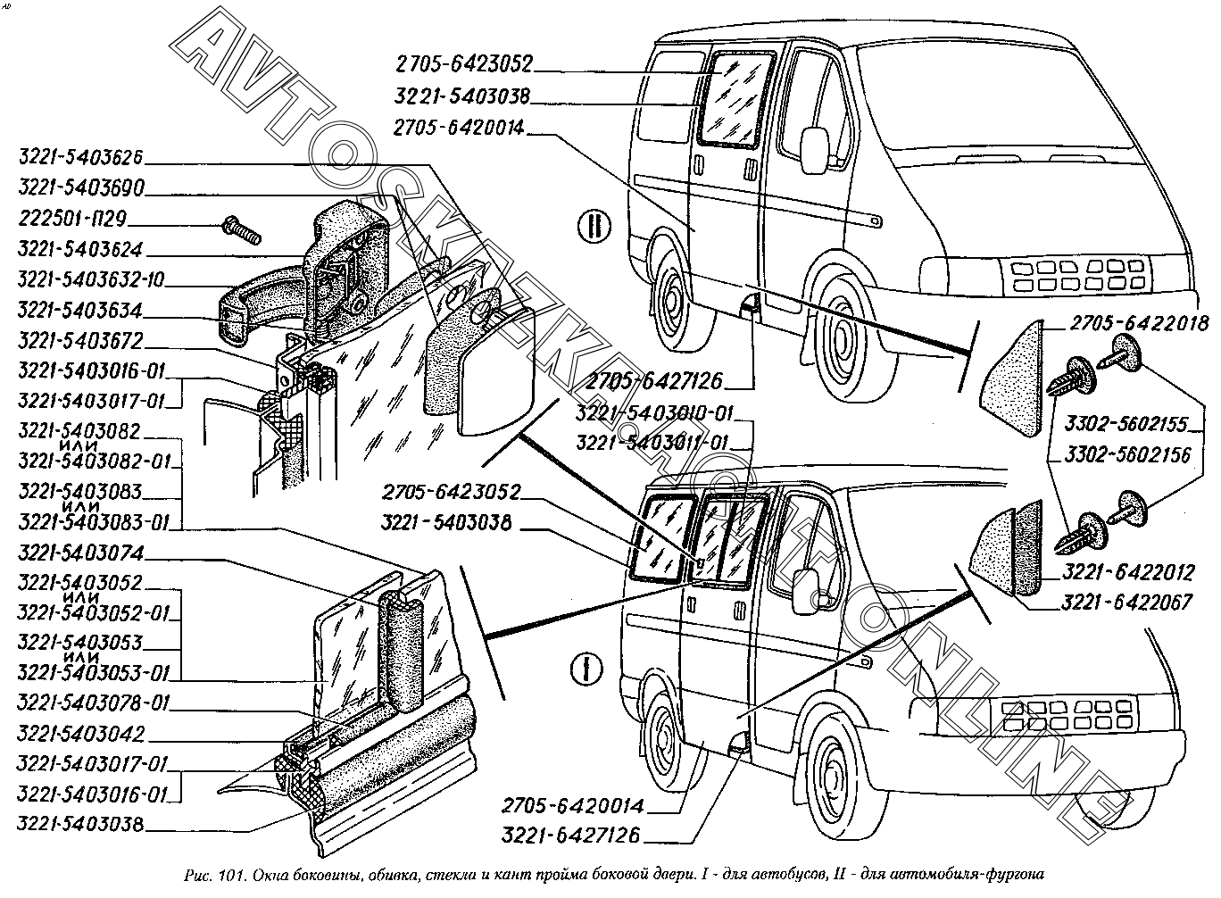 Окна боковины, обивка, стекла и кант проема боковой двери. I - для автобусов, II - для автомобиля-фургона ГАЗ 2217 (22171)