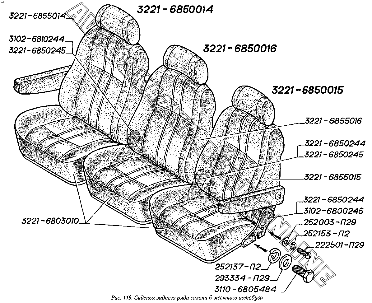 Сиденья заднего ряда салона 6-местного автобуса ГАЗ 2217 (22171)