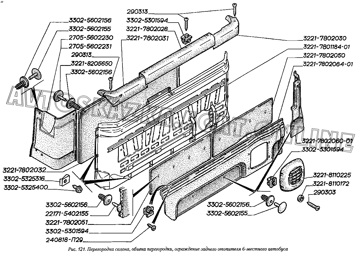 Перегородка салона, обивка перегородки, ограждение заднего отопителя 6-местного автобуса ГАЗ 2217 (22171)