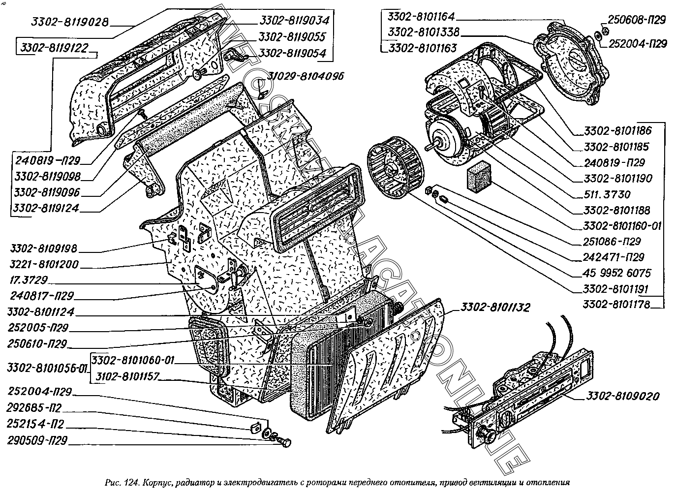 Корпус, радиатор и электродвигатель с роторами переднего отопителя, привод вентиляции и отопления ГАЗ 2217 (22171)