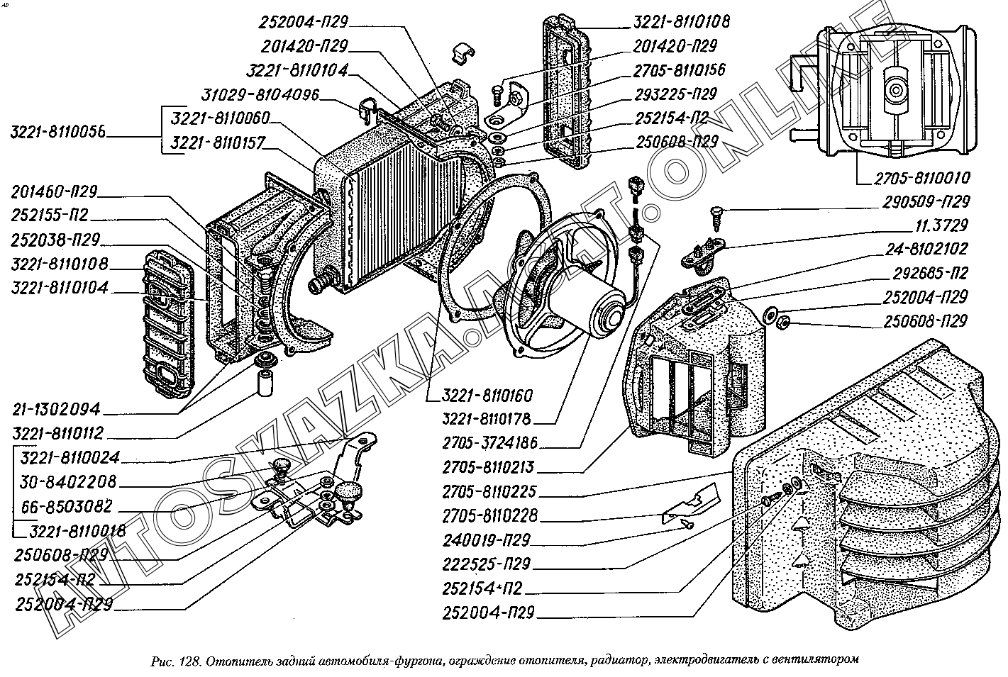 Отопитель задний автомобиля-фургона, ограждение отопителя, радиатор, электродвигатель с вентилятором ГАЗ 2217 (22171)