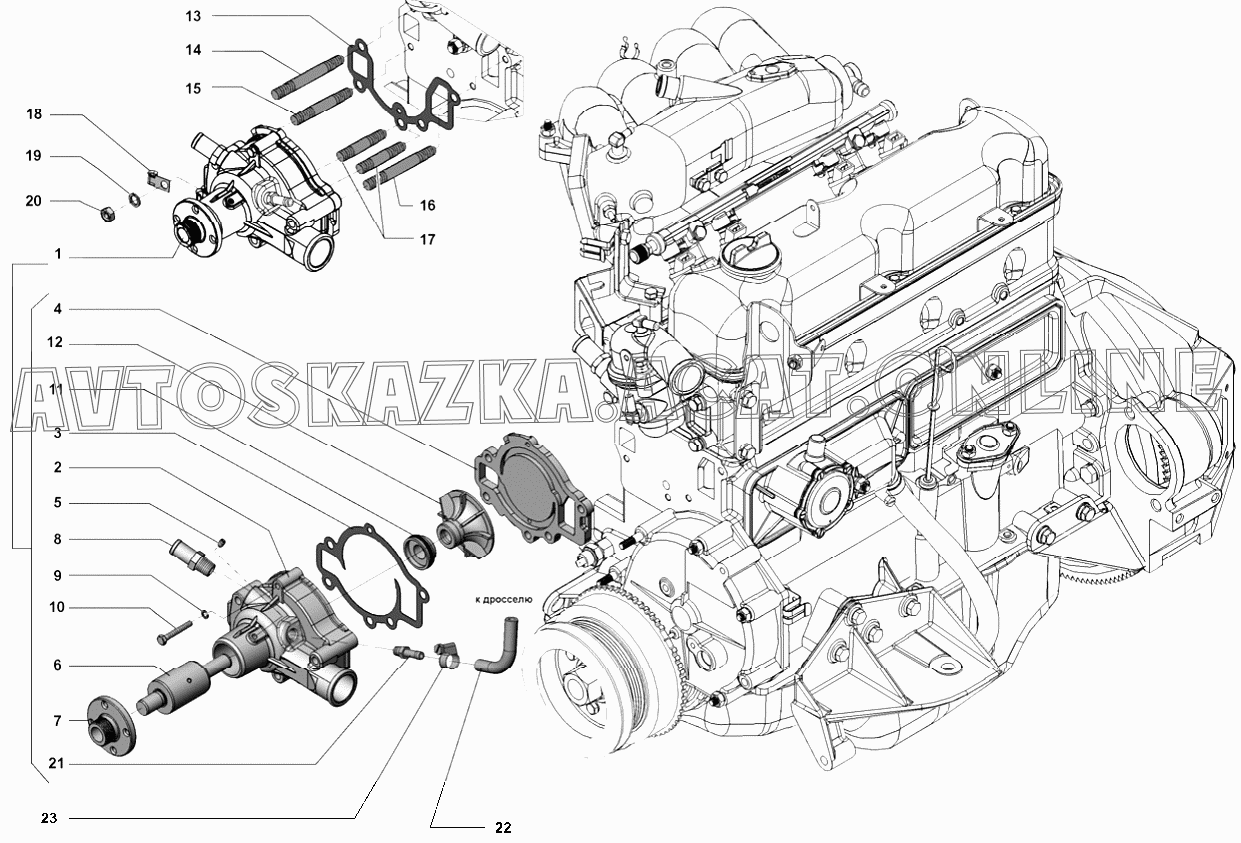 Насос водяной ГАЗ 4216 (4216-70, 4216-50, 4216-71, 4216-51, 4216-72, 4216-52, 4216-73, 4216-53 (Euro-3); 42167-70 (Euro-3) (газобензиновый))