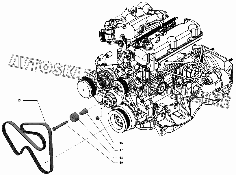 Привод водяного насоса и вентилятора ГАЗ 4216 (4216-70, 4216-50, 4216-71, 4216-51, 4216-72, 4216-52, 4216-73, 4216-53 (Euro-3); 42167-70 (Euro-3) (газобензиновый))