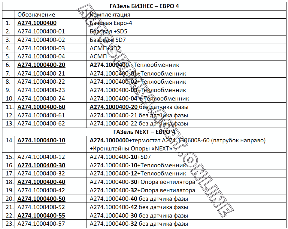 Комплектации двигателей ГАЗ А274 (А274, А274-01, А274-02, А274-03, А274-04, А2747, А2747-01, А2747-02, А274-20, А274-21, А274-22, А274-23, А274-24, А274-10, А274-12, А274-30, А274-32 (Euro-4))