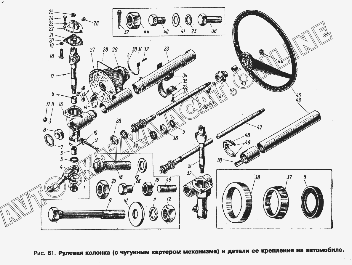 Рулевая колонка (с чугунным картером механизма) и детали ее крепления на автомобиле