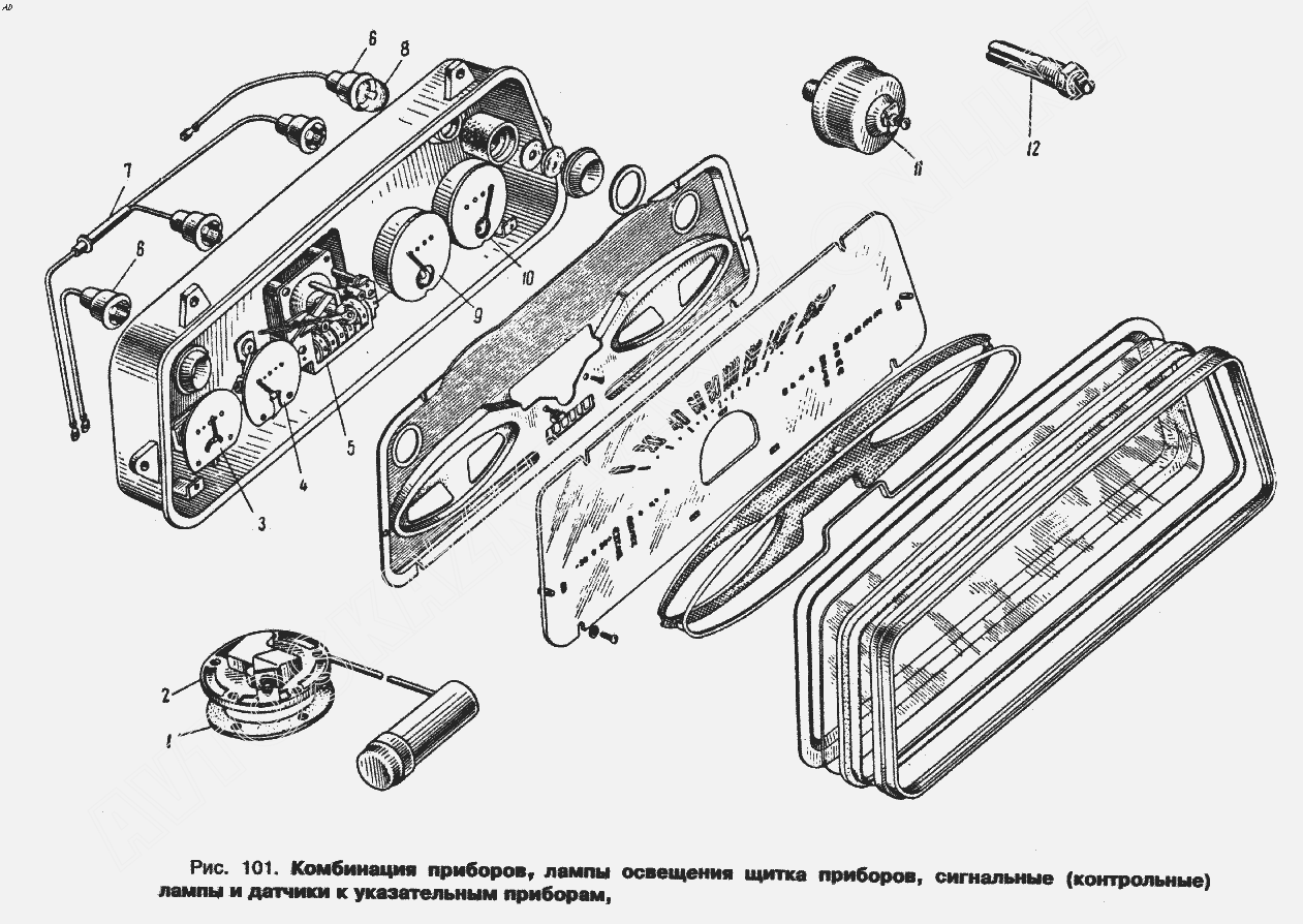 Комбинация приборов, лампы освещения щитка приборов, сигнальные (контрольные) лампы и датчики к указательным приборам