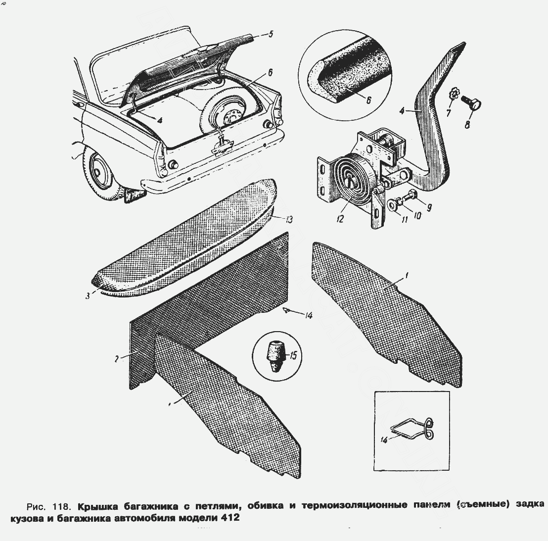 Крышка багажника с петлями, обивка и термошумоизоляционные панели (съемные) задка кузова автомобиля модели 412 ИЖ 434 (434П)