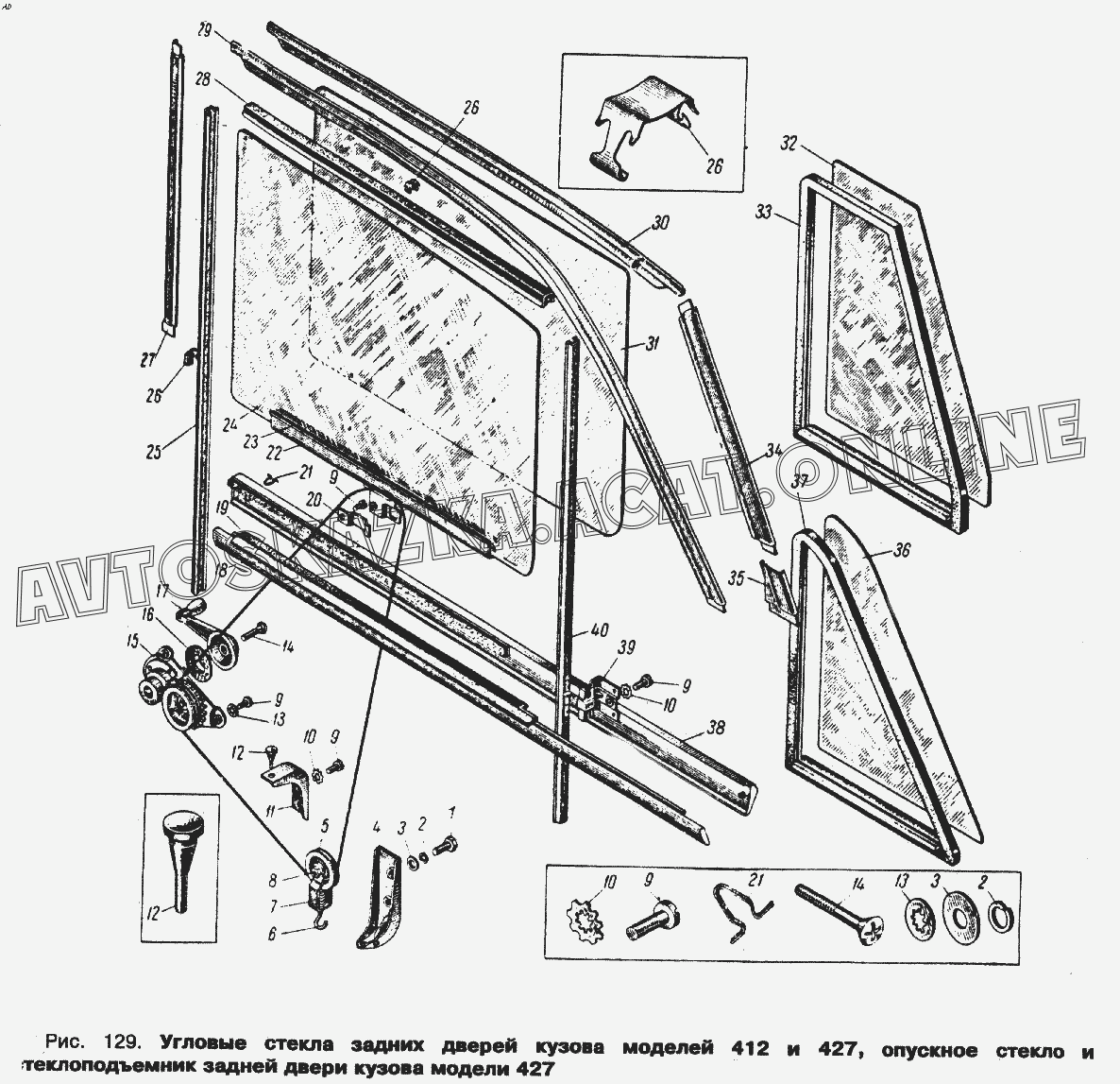 Угловые стекла задних дверей кузова моделей 412 и 427, опускное стекло и стеклоподъемник задней двери кузова модели 427