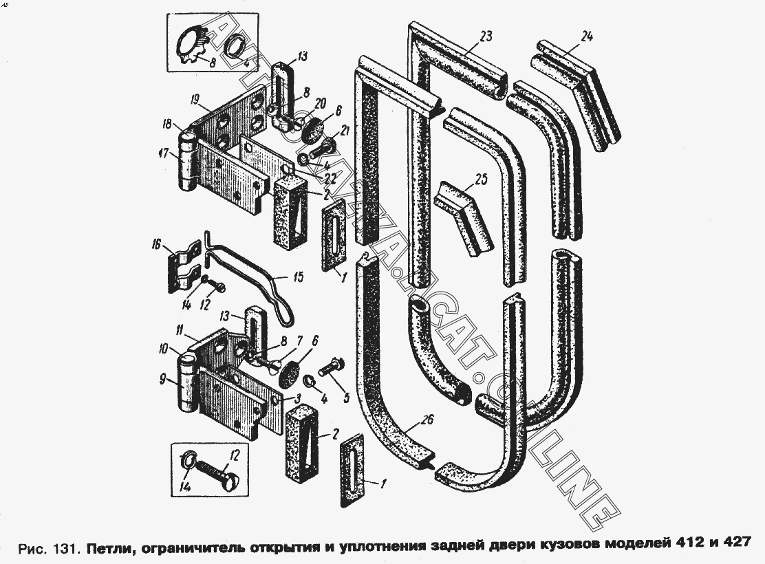 Петли, ограничители открытия и уплотнения задней двери кузовов моделей 412 и 427