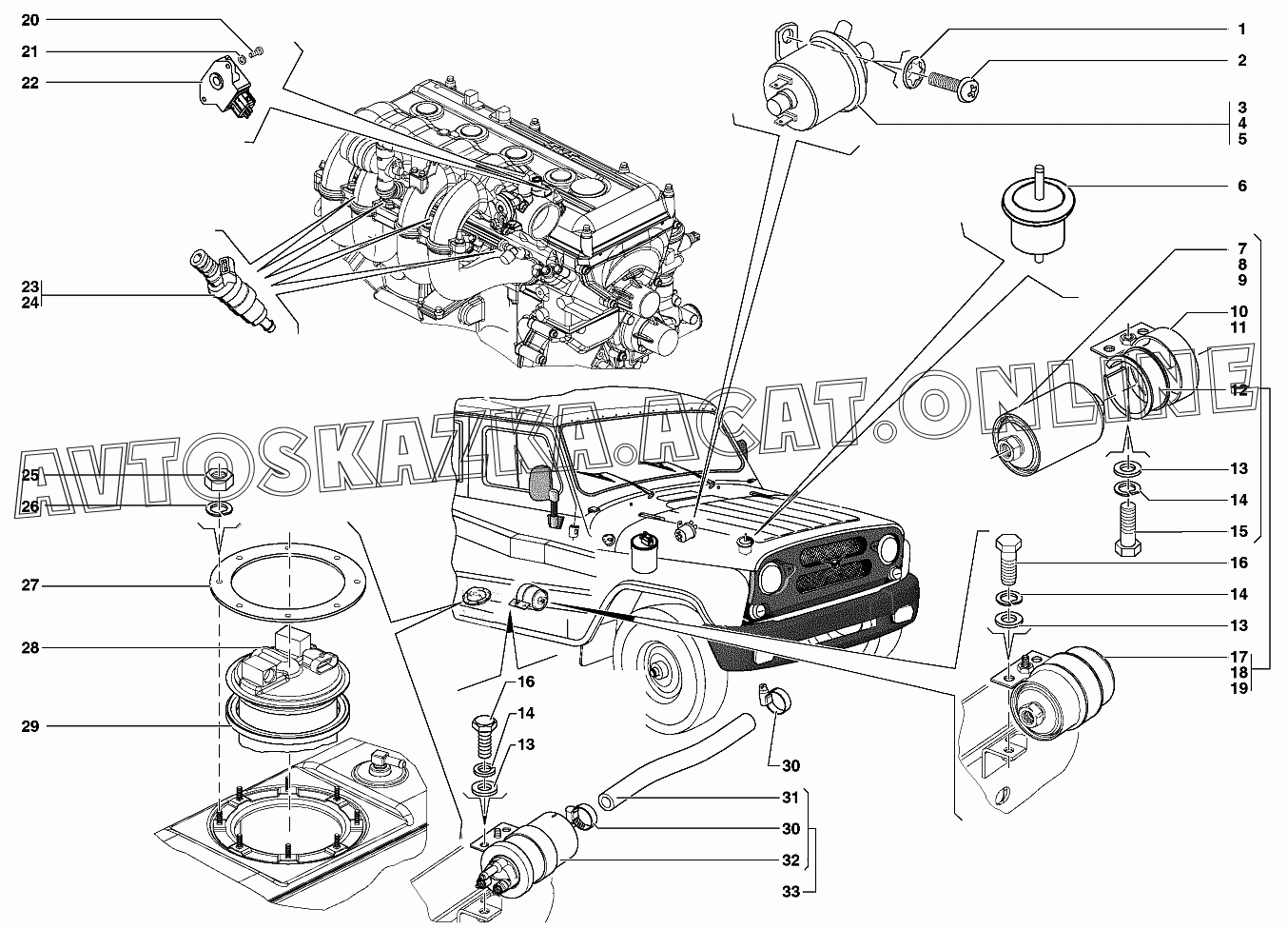 Клапан топливный электромагнитный, фильтр тонкой очистки топлива, датчики аппаратуры впрыска топлива с электронным управлением, форсунка электромагнитная, насос топливный низкого давления электрический УАЗ 31519 (УАЗ "Хантер" (-31512-010, -31514-012, -31519-017, 315195-030, -315195-036, -315148-095, -315148-195, -315194-010))