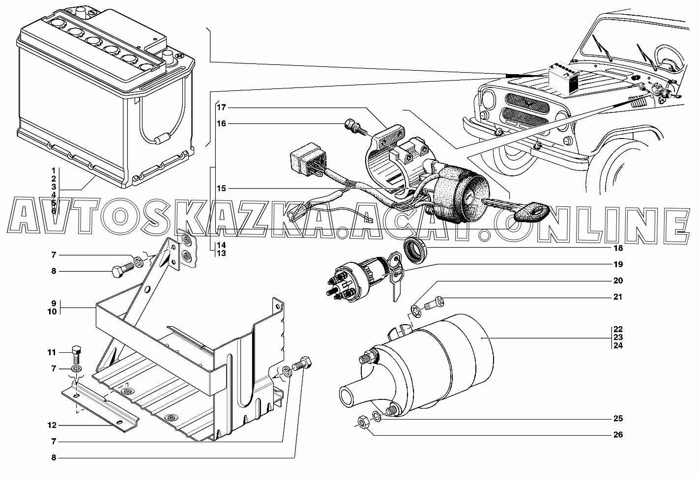 Батарея аккумуляторная, выключатель зажигания, катушка зажигания УАЗ 31519 (УАЗ "Хантер" (-31512-010, -31514-012, -31519-017, 315195-030, -315195-036, -315148-095, -315148-195, -315194-010))