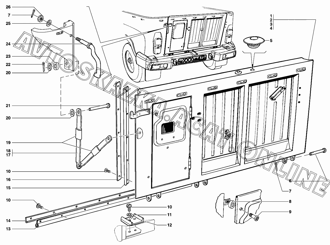Борт задний в сборе, петли заднего борта, запор заднего борта УАЗ 31519 (УАЗ "Хантер" (-31512-010, -31514-012, -31519-017, 315195-030, -315195-036, -315148-095, -315148-195, -315194-010))