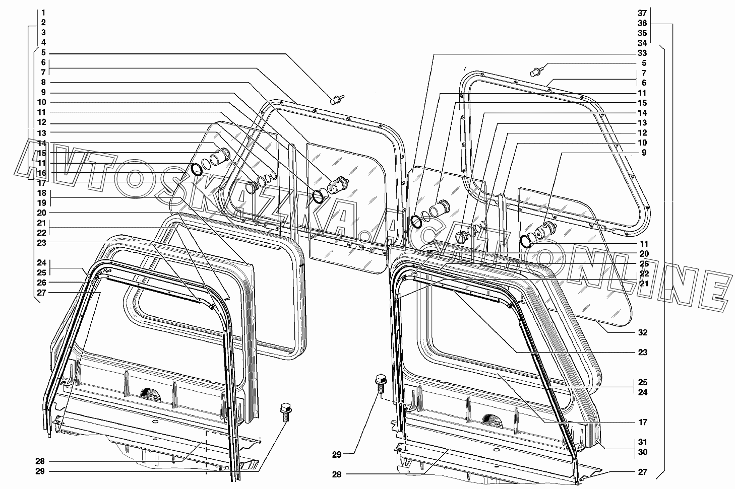 Надставка передней двери в сборе, окно надставки передней двери, уплотнение надставки передней двери, надставка задней двери в сборе, окно надставки задней двери уплотнение надставки задней двери