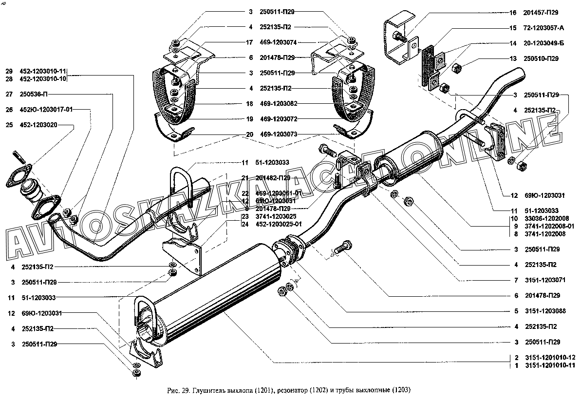 Глушитель выхлопа (1201), резонатор (1202) и трубы выхлопные (1203) УАЗ 3962 (39629)