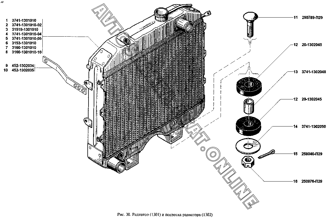 Радиатор (1301) и подвеска радиатора (1302) УАЗ 3962 (39629)