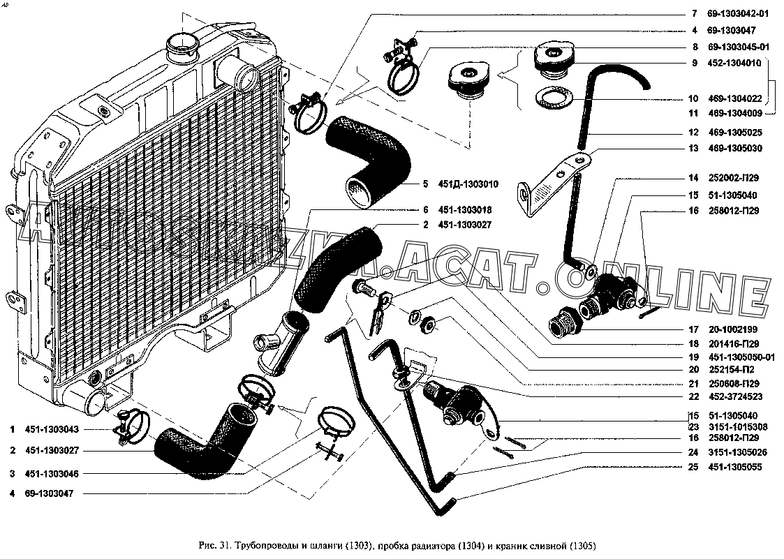 Трубопроводы и шланги (1303), пробка радиатора (1304) и краник сливной (1305) УАЗ 3962 (39629)
