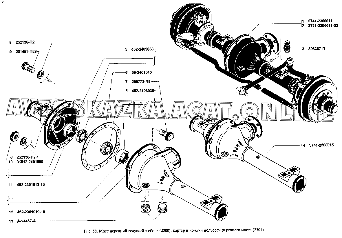Мост передний ведущий в сборе (2300), картер и кожухи полуосей переднего моста (2301)