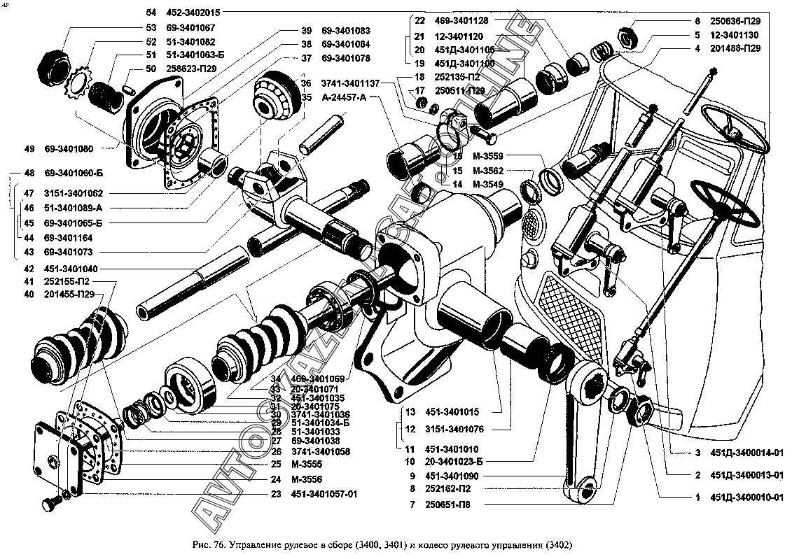 Управление рулевое в сборе (3400, 3401) и колесо рулевого управления (3402) УАЗ 3962 (39629)