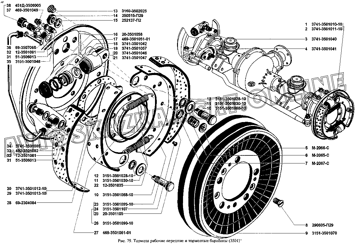 Тормоза рабочие передние и тормозные барабаны (3501) УАЗ 3962 (39629)