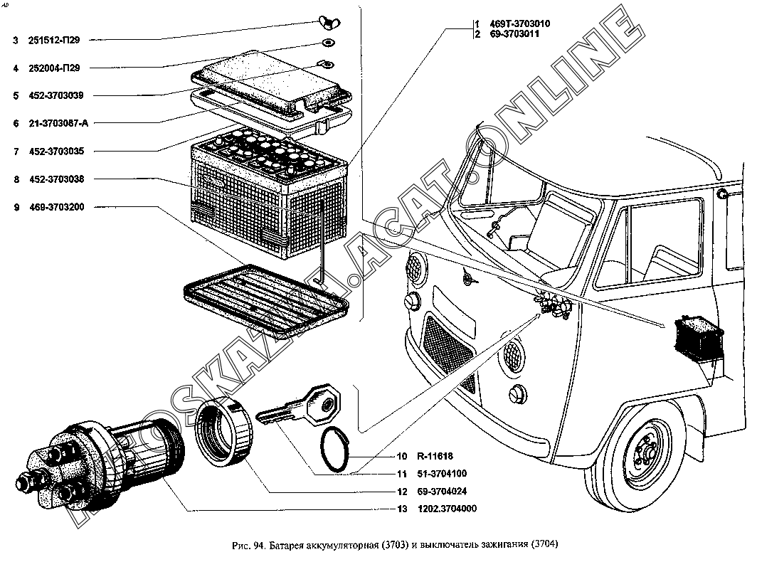 Батарея аккумуляторная (3703) и выключатель зажигания (3704) УАЗ 3962 (39629)
