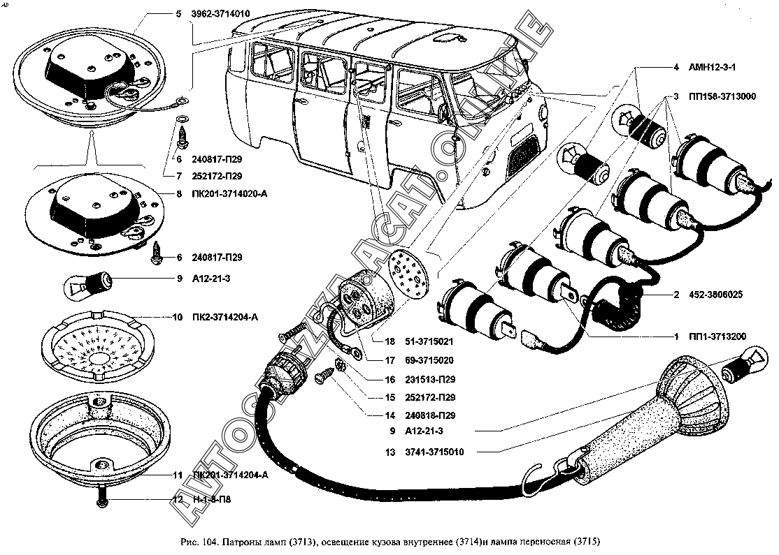 Патроны ламп (3713), освещение кузова внутреннее (3714) и лампа переносная (3715) УАЗ 3962 (39629)