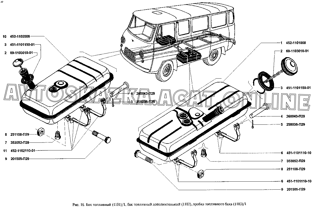 Бак топливный (1101)/1, бак топливный дополнительный (1102), пробка топливного бака (1103)/1 УАЗ 3909 (39094, 39095, 39099)