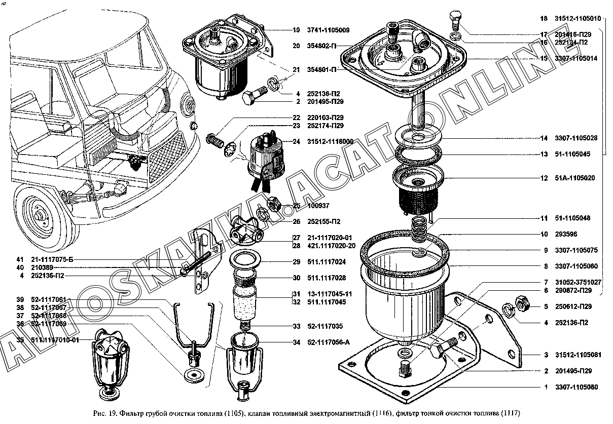 Фильтр грубой очистки топлива (1105), клапан топливный электромагнитный (1116), фильтр тонкой очистки топлива (1117) УАЗ 3909 (39094, 39095, 39099)