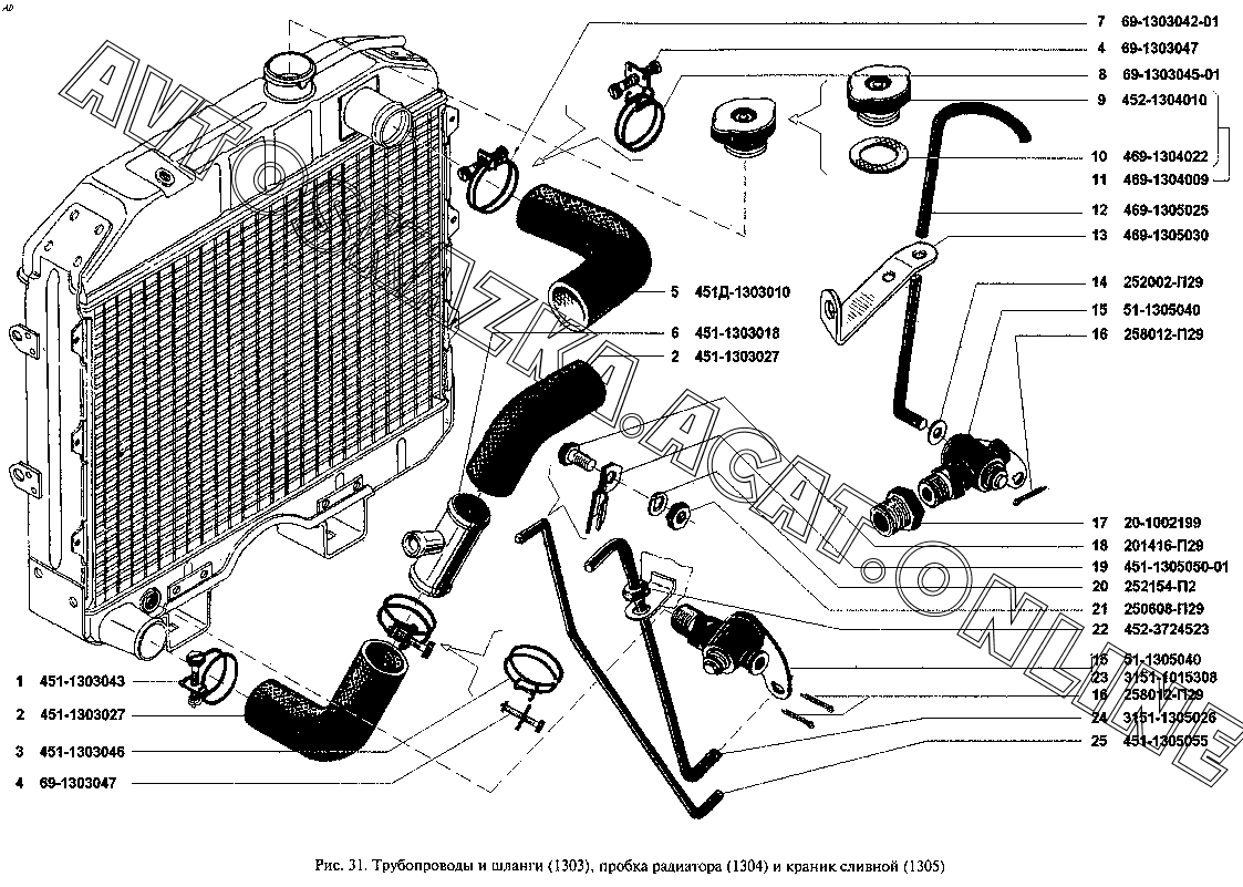 Трубопроводы и шланги (1303), пробка радиатора (1304) и краник сливной (1305) УАЗ 3909 (39094, 39095, 39099)