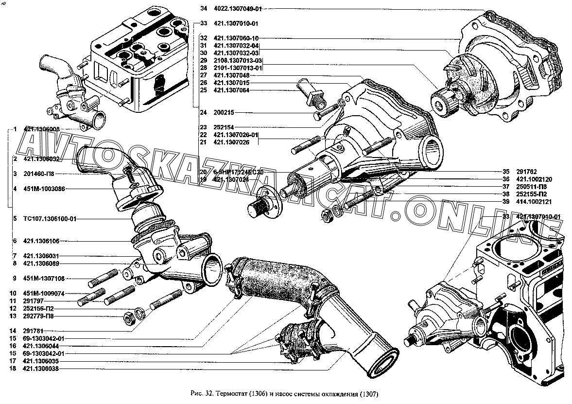 Термостат (1306) и насос системы охлаждения (1307) УАЗ 3909 (39094, 39095, 39099)