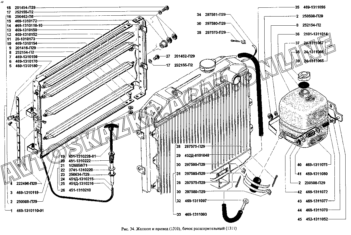 Жалюзи и привод (1310), бачок расширительный (1311) УАЗ 3909 (39094, 39095, 39099)