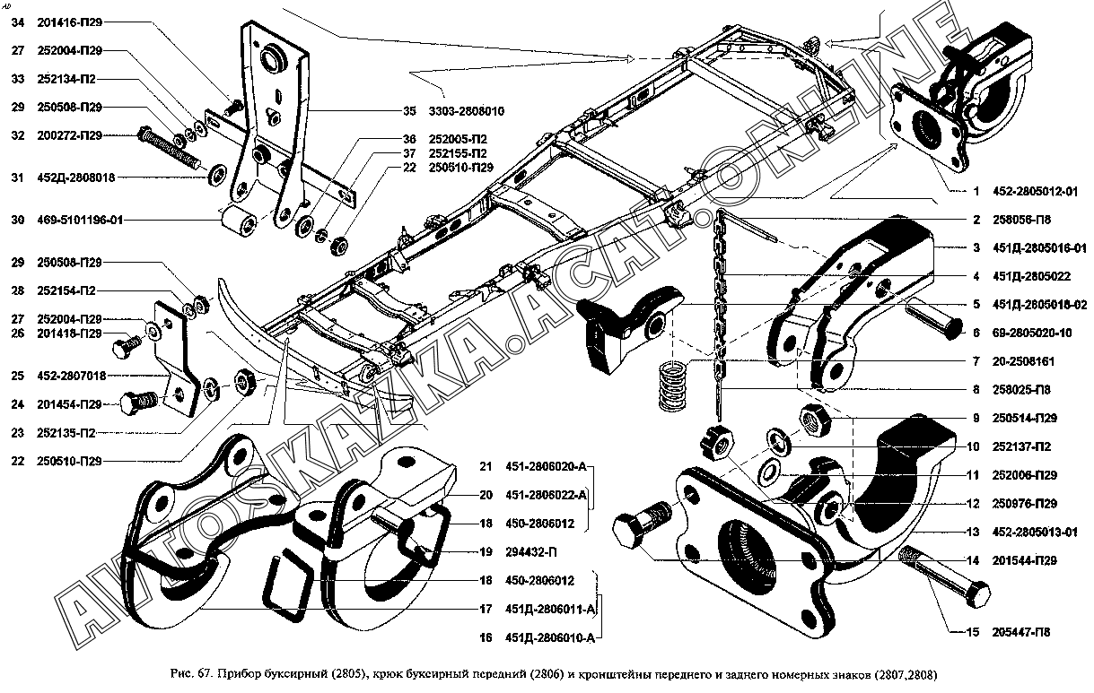 Прибор буксирный (2805), крюк буксирный передний (2806) и кронштейны переднего и заднего номерных знаков (2807,2808)