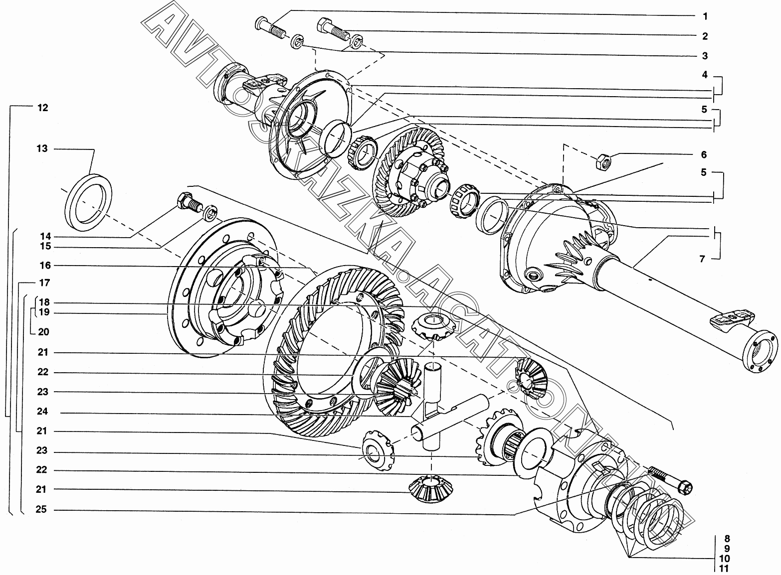 Картер и кожухи полуосей переднего моста, дифференциал переднего моста