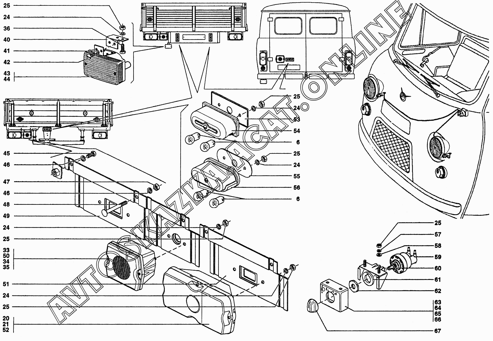 Фонари задние, фонарь освещения номерного знака, гидрокорректор УАЗ 37419 (374194 (Euro-2), 374194 (Euro-3), 374195 (Euro-2), 374195 (Euro-3))