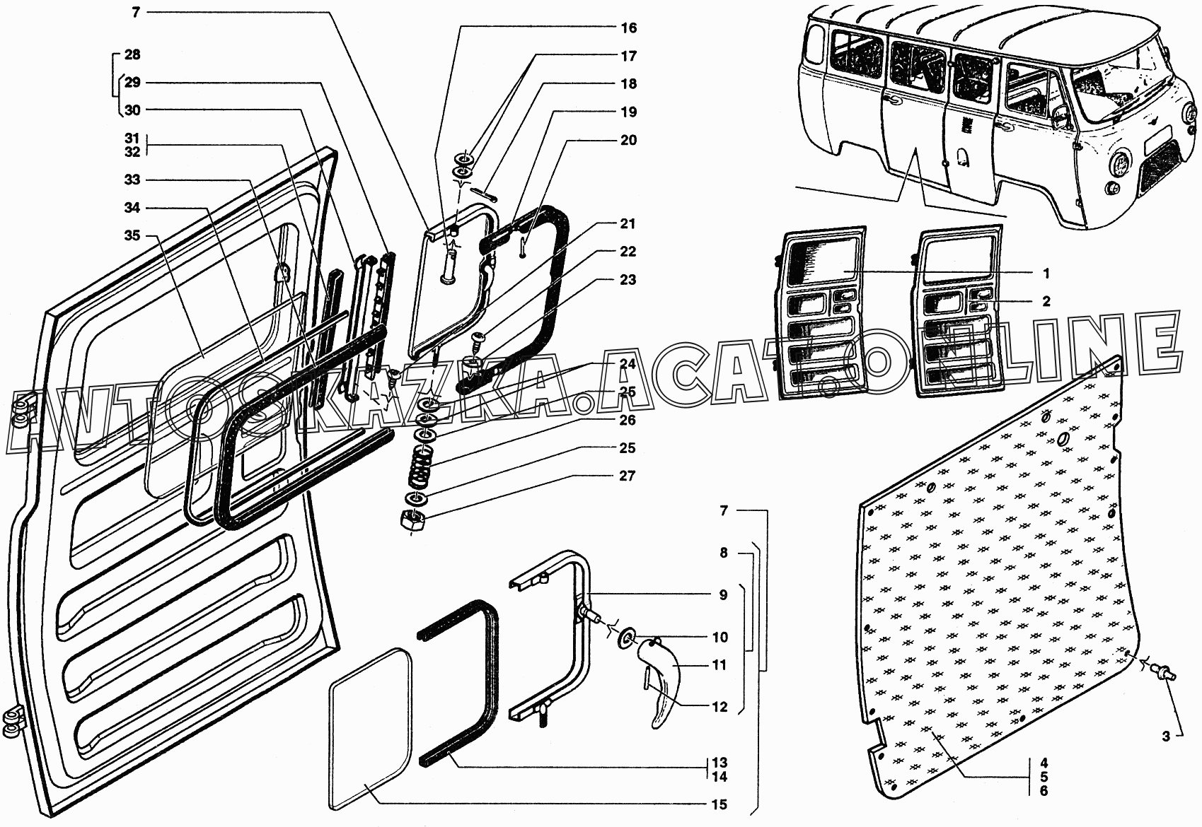 Дверь задняя в сборе, обивка и окно задней двери УАЗ 37419 (374194 (Euro-2), 374194 (Euro-3), 374195 (Euro-2), 374195 (Euro-3))