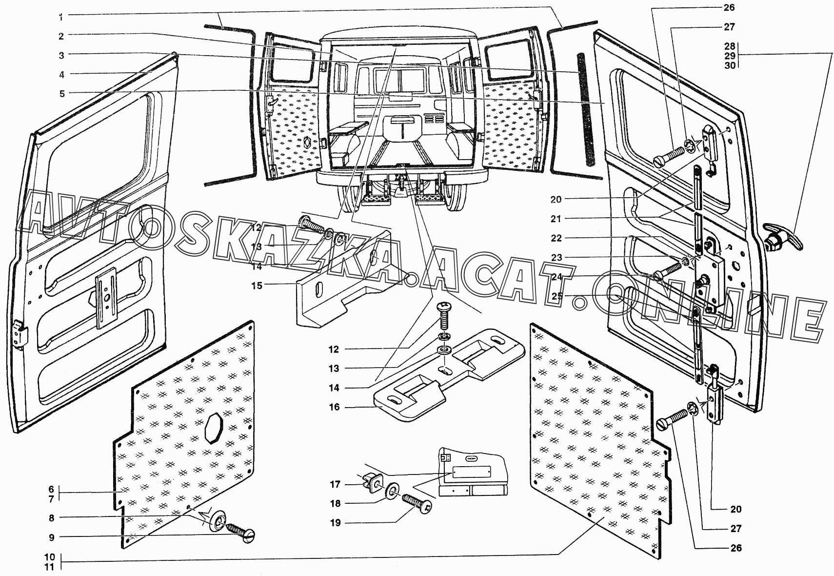 Дверь задка, уплотнители, обивка, замок и ручки двери задка УАЗ 37419 (374194 (Euro-2), 374194 (Euro-3), 374195 (Euro-2), 374195 (Euro-3))
