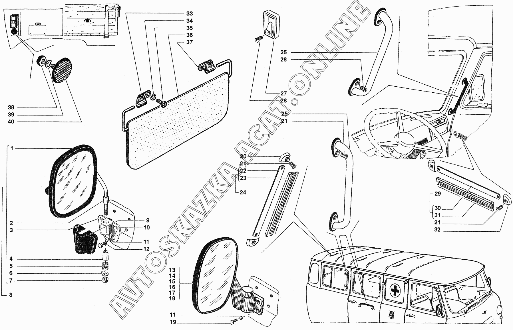 Зеркало, держатель и крючки для одежды, козырек противосолнечный, отражатели света УАЗ 39094 (390944 (Euro-2), 390944 (Euro-3), 390945 (Euro-2), 390945 (Euro-3))