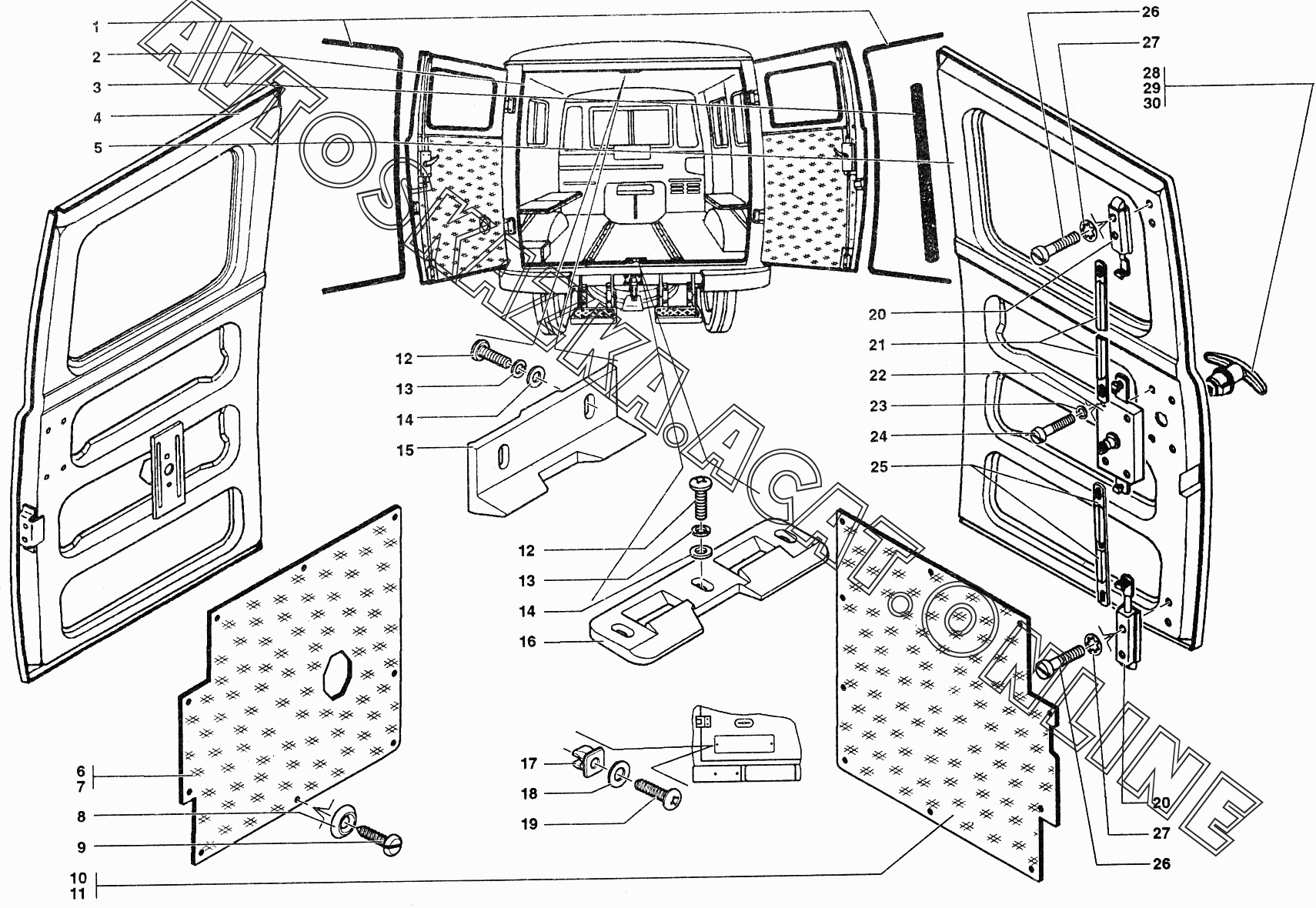 Дверь задка, уплотнители, обивка, замок и ручки двери задка УАЗ 39094 (390944 (Euro-2), 390944 (Euro-3), 390945 (Euro-2), 390945 (Euro-3))
