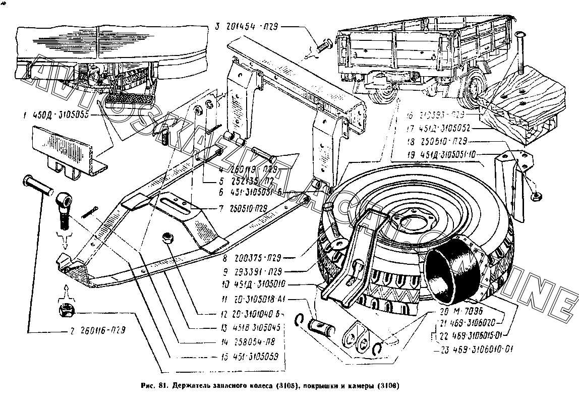 Держатель запасного колеса (3105), покрышки и камеры (3106) УАЗ 2206