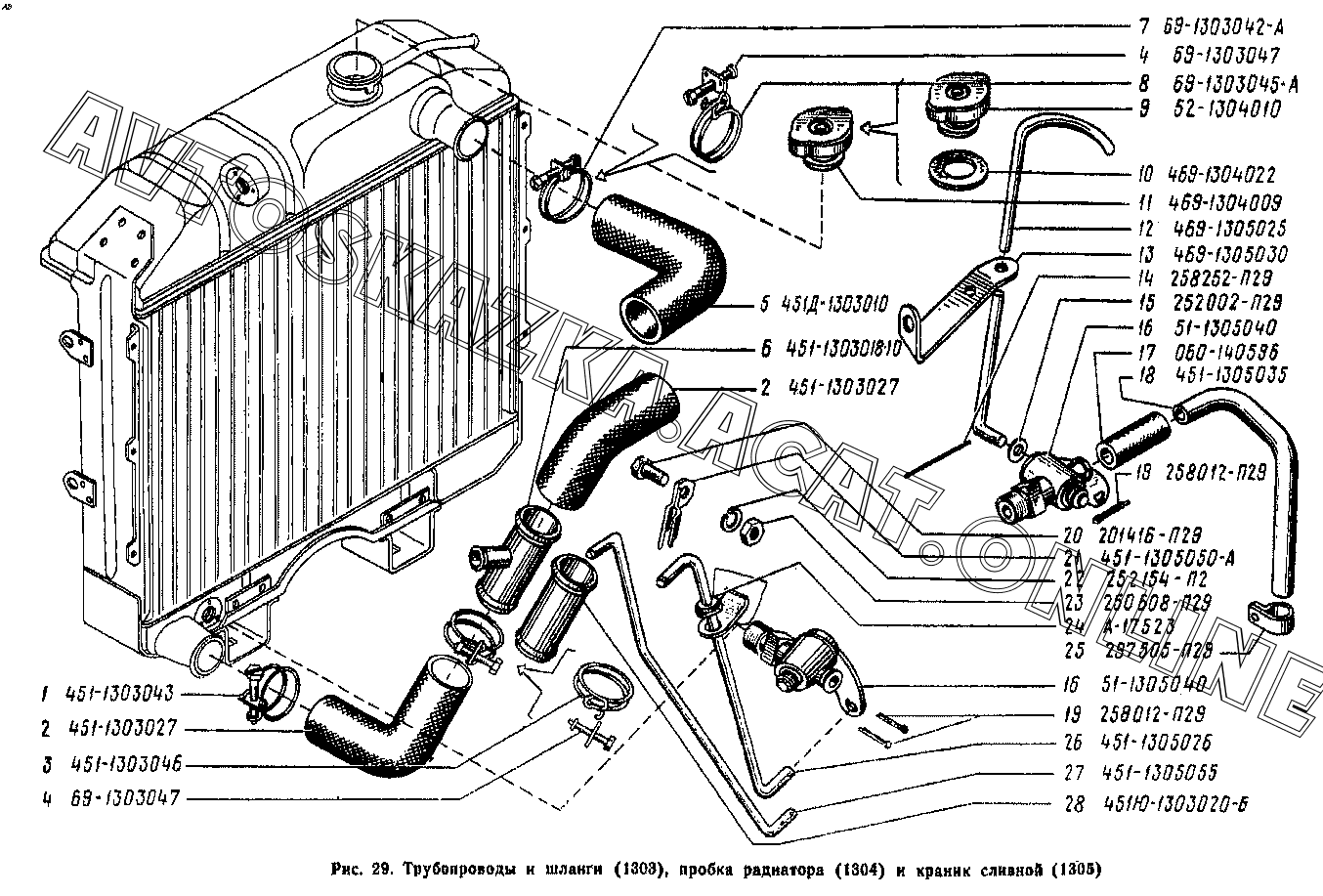 Трубопроводы и шланги (1303), пробка радиатора (1304) и краник сливной (1305) УАЗ 3741