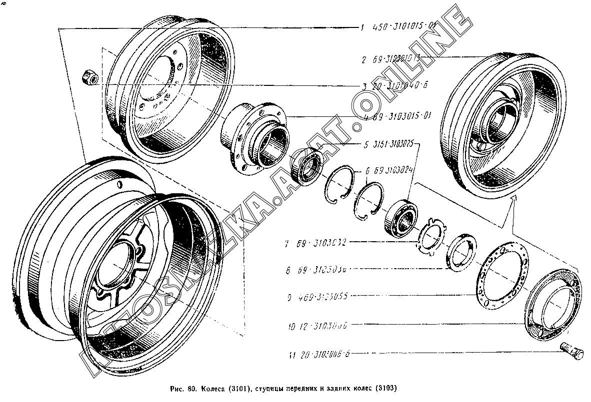 Колеса (3101), ступицы передних и задних колес (3103) УАЗ 3741