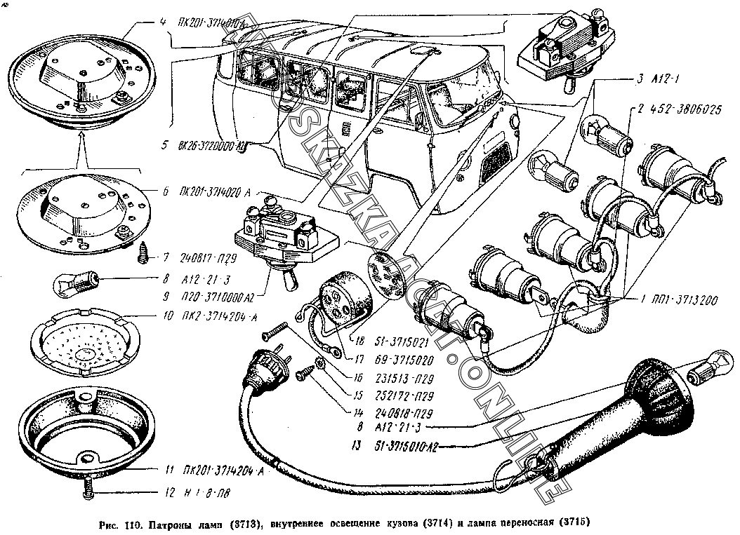 Патроны ламп (3713), внутреннее освещение кузова (3714) и лампа переносная (3715)