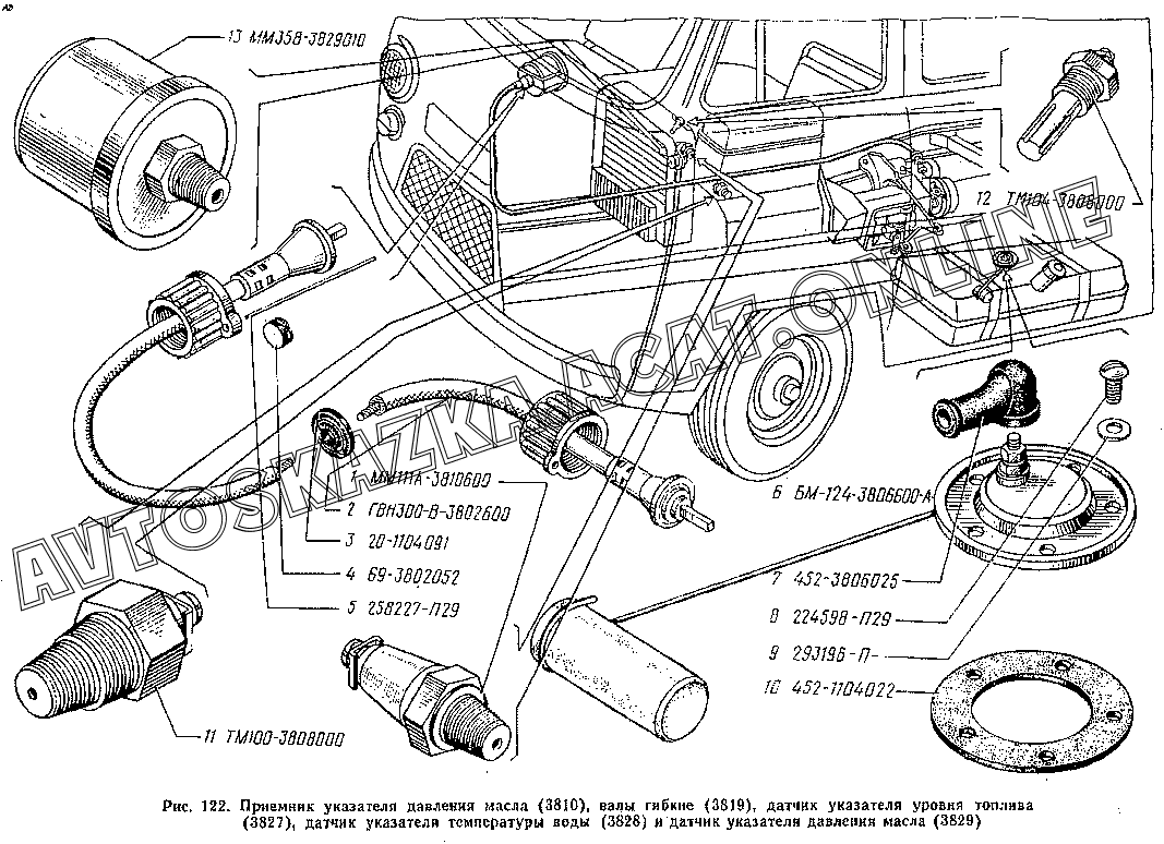 Приемник указателя давления масла (3810), валы гибкие (3819), датчик указателя уровня топлива (3827), датчик указателя температуры воды (3828) и датчикуказателя давления масла (3829)