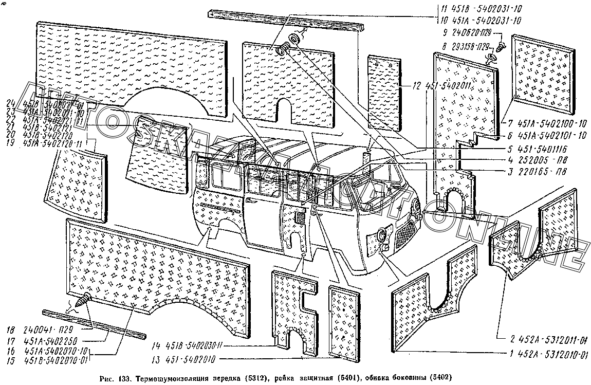 Термошумоизоляция передка (5312), рейка защитная (5401), обивка боковины (5402) УАЗ 3741