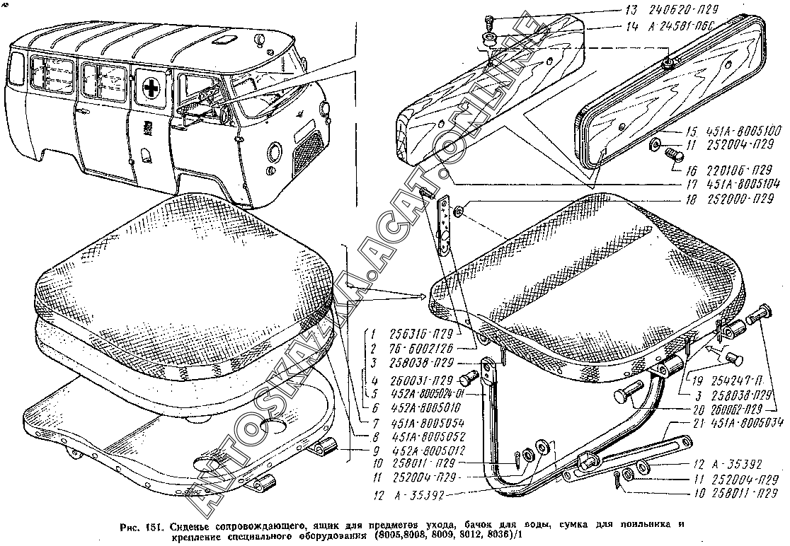 Сиденье сопровождающего, ящик для предметов ухода, бачок для воды, сумка для поильника и крепление специального оборудования (8005,8008,8009,8012, 8036)/1 УАЗ 3741
