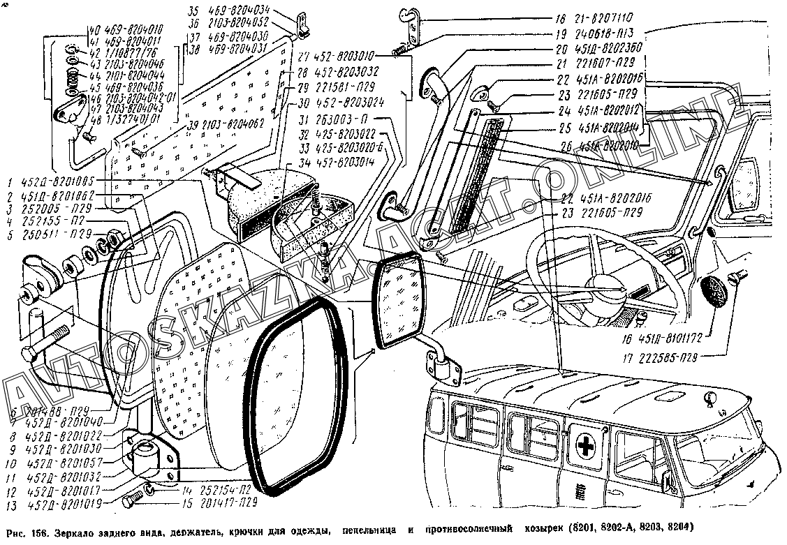 Зеркало заднего вида, держатель, крючки для одежды, пепельница и противосолнечный козырек (8201, 8202-А, 8203, 8204) УАЗ 3741