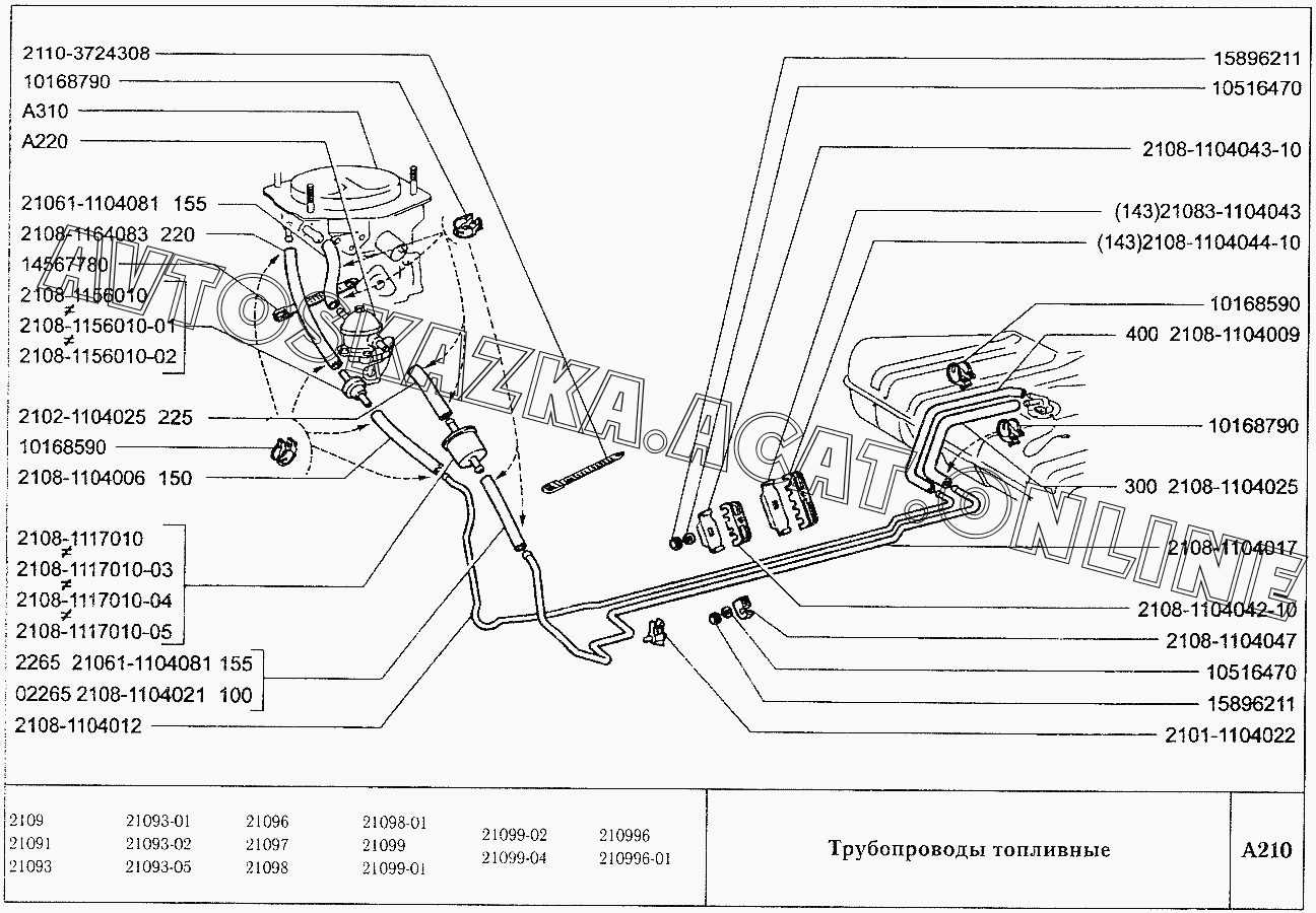 Трубопроводы топливные ВАЗ 2109 (2109, 21091, 21093, 21093-01, 21093-02, 21093-05, 21096, 21097, 21098, 21098-01 (карб.), 21093-20, 21093-21, 21093-22, 21093-23, 21093-24, 21093-25, 21098-22 (впрыск))