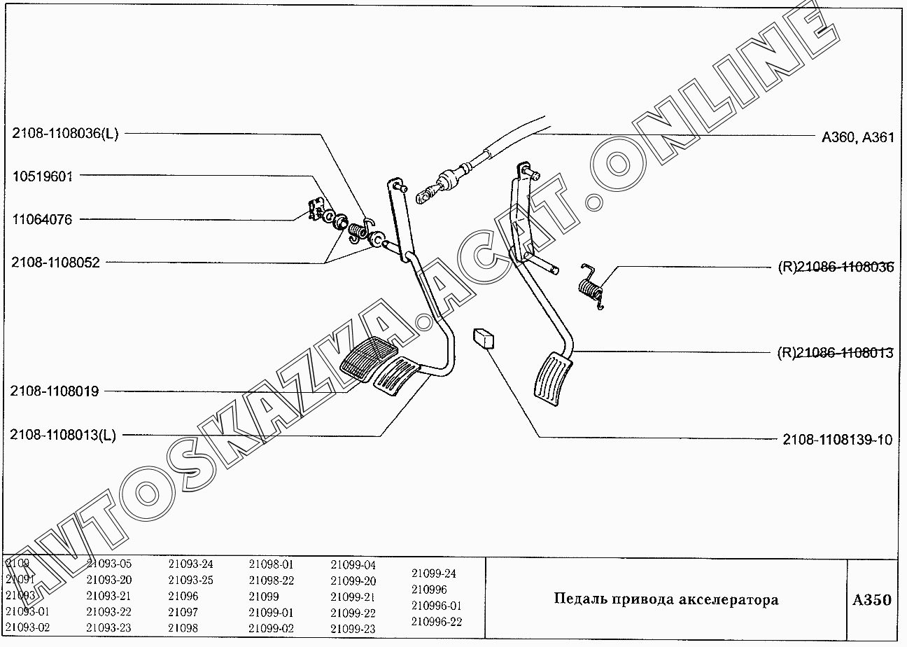 Педаль привода акселератора ВАЗ 2109 (2109, 21091, 21093, 21093-01, 21093-02, 21093-05, 21096, 21097, 21098, 21098-01 (карб.), 21093-20, 21093-21, 21093-22, 21093-23, 21093-24, 21093-25, 21098-22 (впрыск))