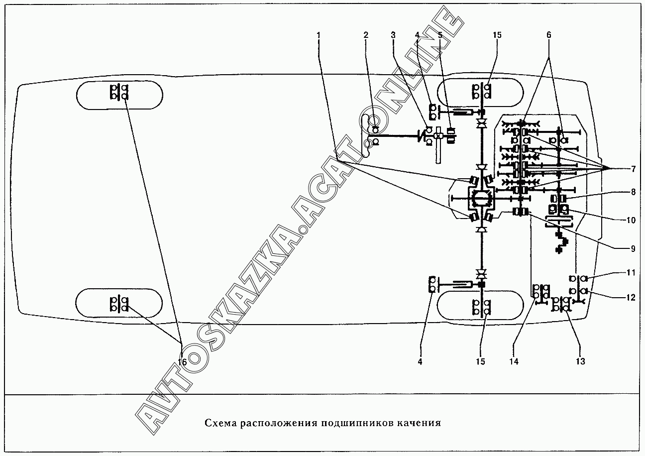 Схема расположения подшипников качения ВАЗ 2109 (2109, 21091, 21093, 21093-01, 21093-02, 21093-05, 21096, 21097, 21098, 21098-01 (карб.), 21093-20, 21093-21, 21093-22, 21093-23, 21093-24, 21093-25, 21098-22 (впрыск))
