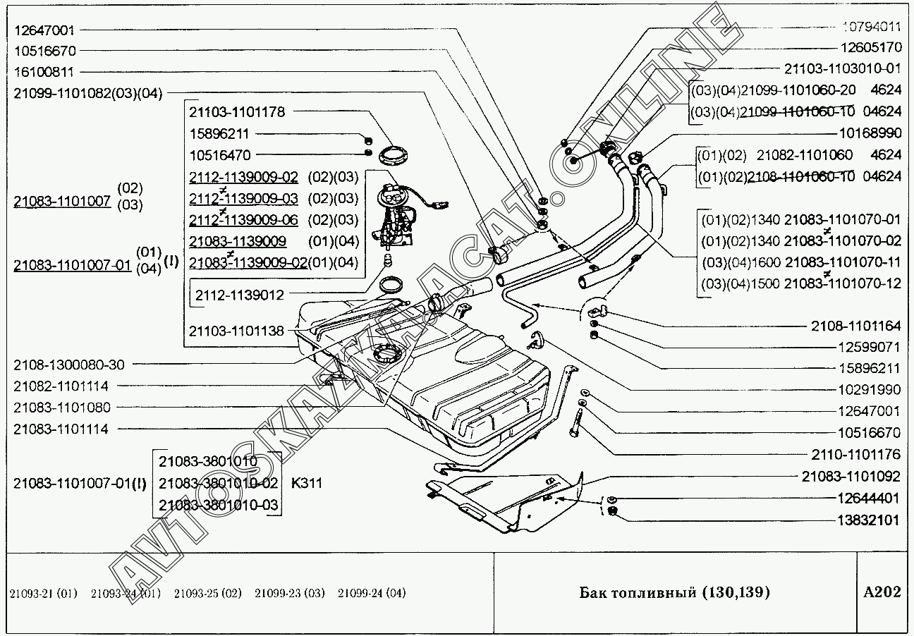 Бак топливный (130,139) ВАЗ 21099 (21099, 21099-01, 21099-02, 21099-04, 210996, 210996-01 (карб.), 21099-20, 21099-21, 21099-22, 21099-23, 21099-24, 210996-22 (впрыск))